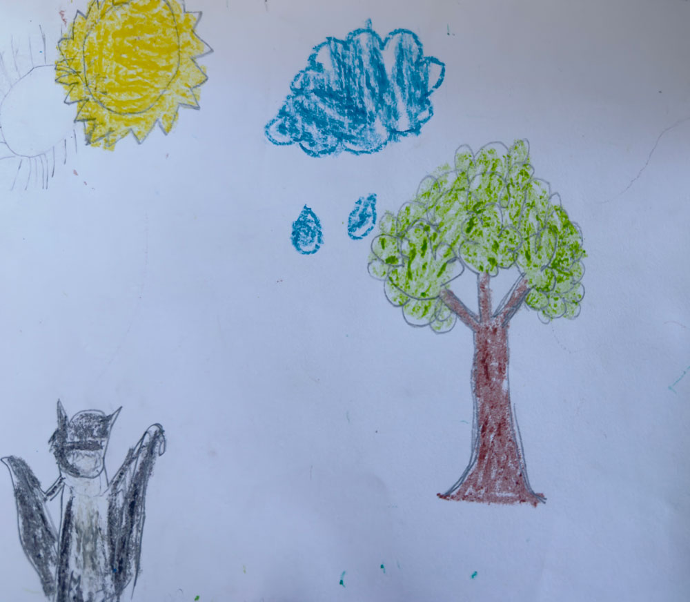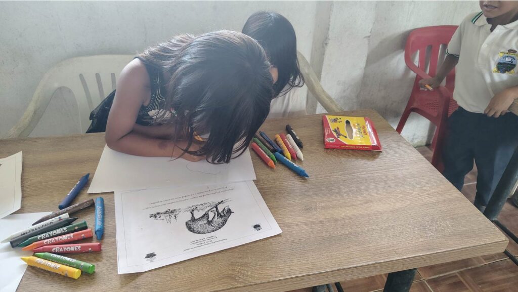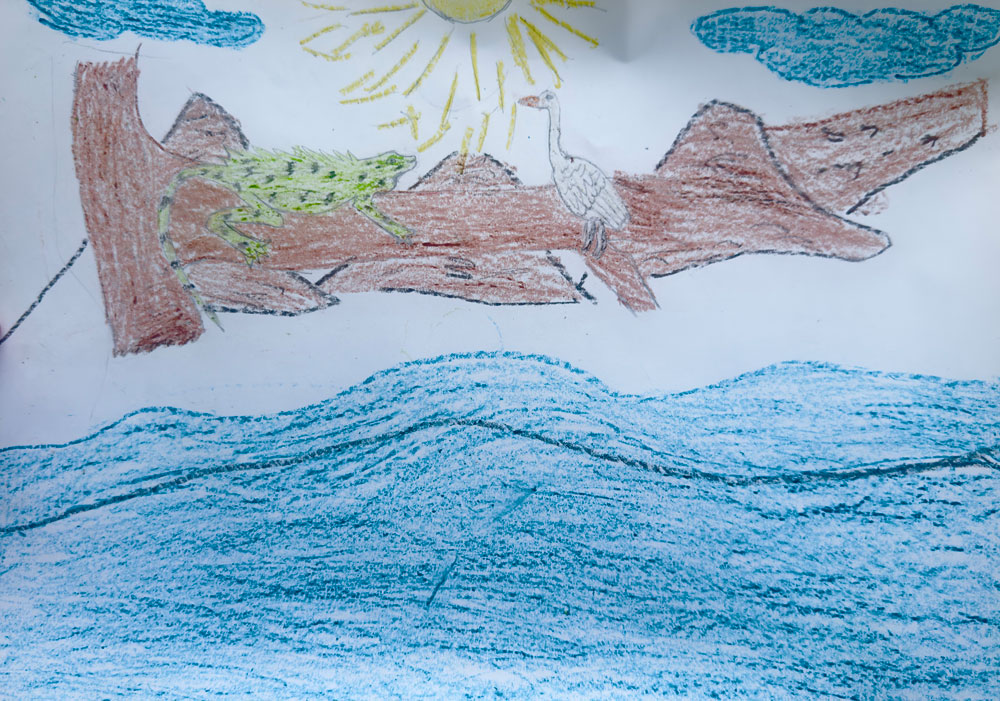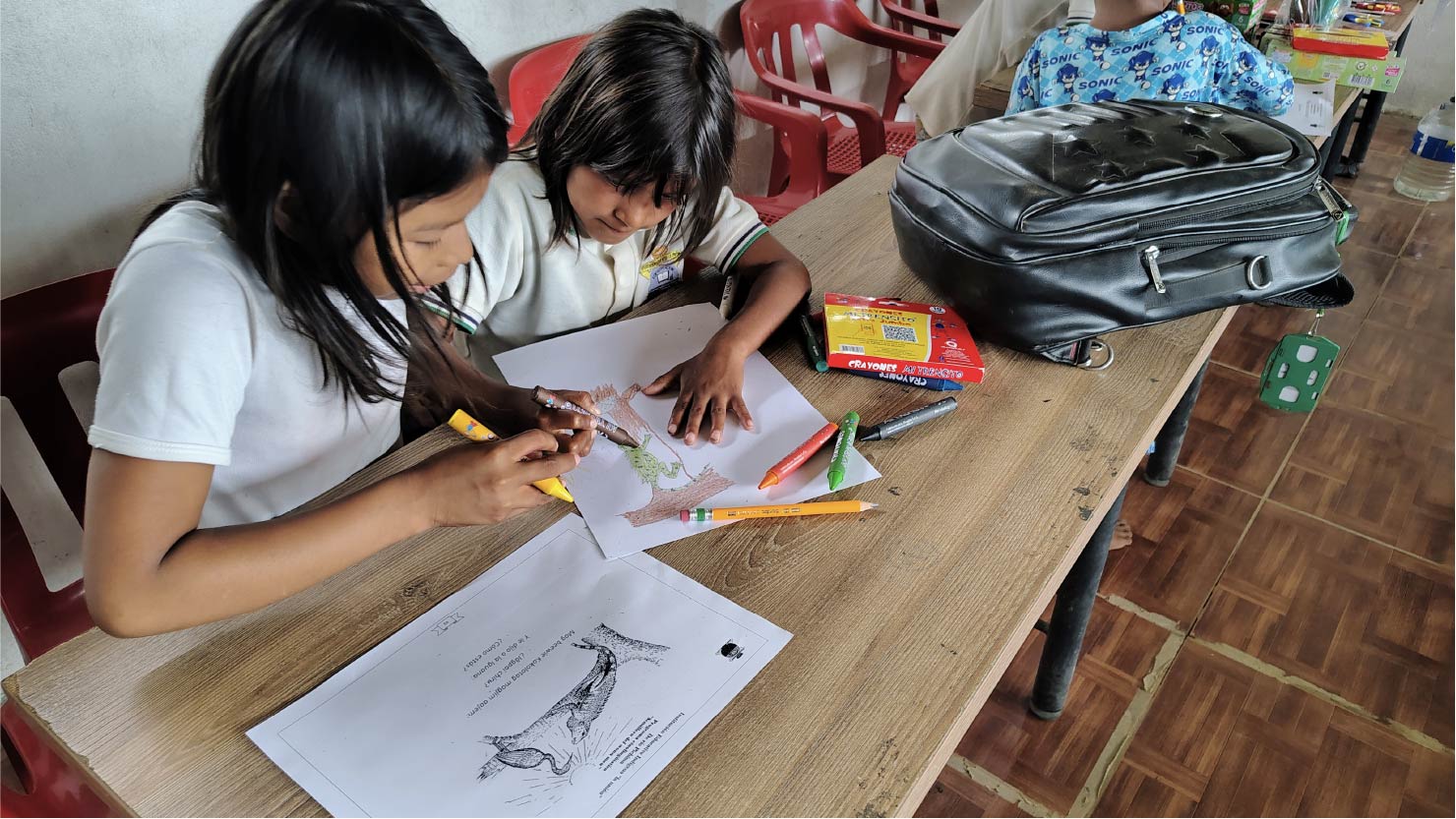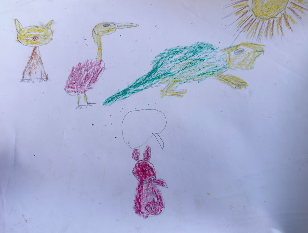 Fotografías de los dibujos y texturas creados por los niños y niñas durante los talleres artísticos. Imágenes que retratan el proceso en las aulas y el territorio, donde la palabra y el color se encuentran.